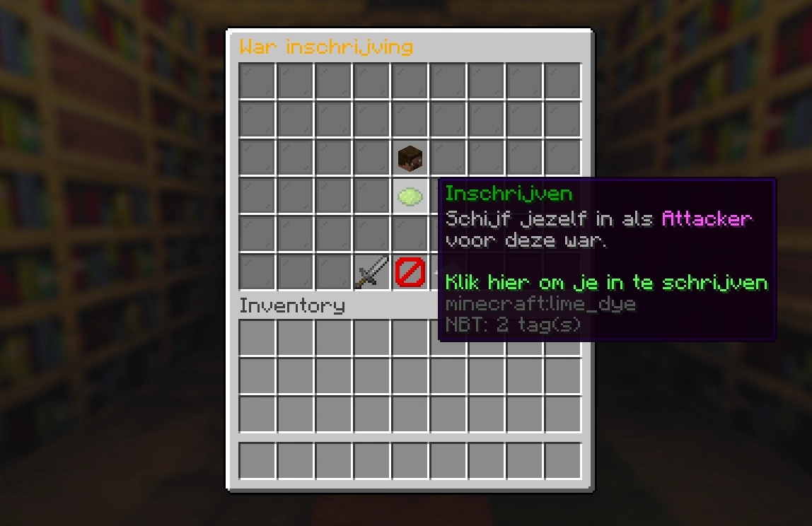 Inschrijven doe je via het commando /war signup. Na het uitvoeren van dit commando krijg je een overzicht van alle geplande wars. Selecteer de war(s) waaraan je wil deelnemen en klik op het groene bolletje om jezelf aan te melden. Als je reeds bent ingeschreven en je kan toch niet deelnemen is het in het belang van jouw kingdom/alliance om je af te melden zodat er niet meer spelers laattijdig kunnen inschrijven.