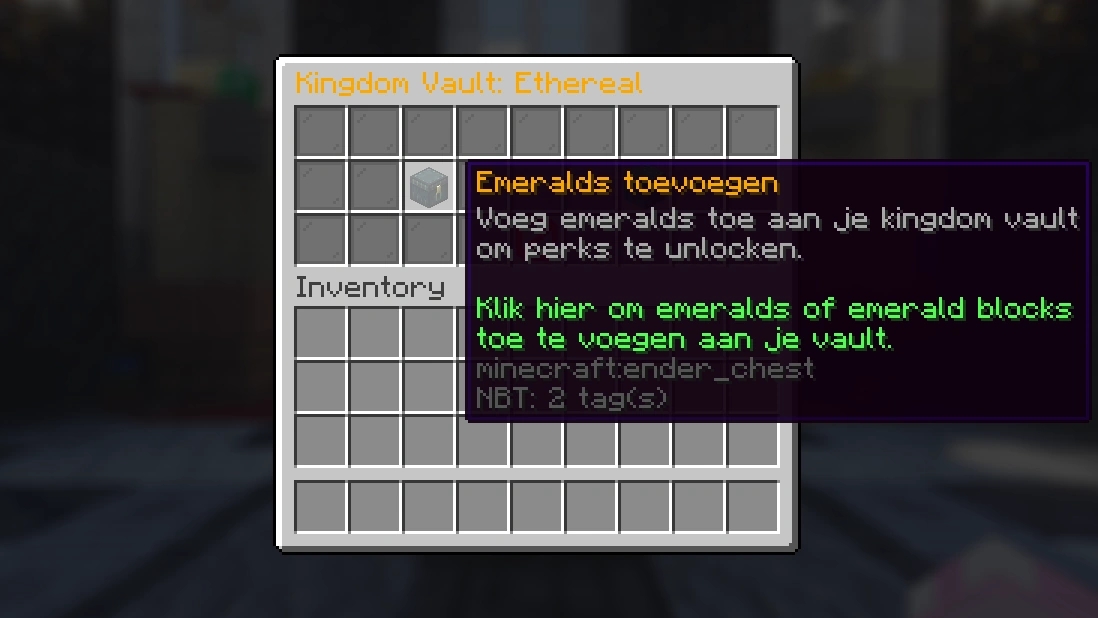 Dit doe je door te interacten met de kingdom vault op /warp vault. Vervolgens klik je op de enderchest om alle emeralds en emerald blocks in je inventory toe te voegen aan de vault.